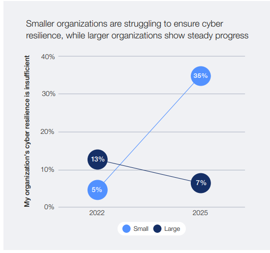 According to the “Global Cybersecurity Outlook” 2025 by the World Economic Forum in collaboration with Accenture, approximately 35% of small businesses believe their cyber resilience is inadequate – a figure that has increased sevenfold since 2022.