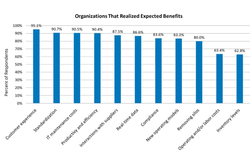 - Customer Experience: A remarkable 95.1% of organizations aiming to improve customer experience through ERP succeeded. ERP proves its ability to enhance customer interactions, streamline service processes, and personalize customer engagement.